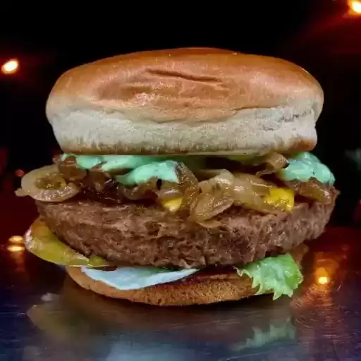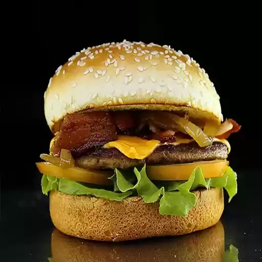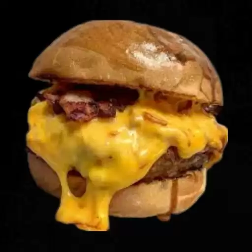 Um delicioso hambúrguer artesanal de 140 gramas com bacon e um saboroso queijo cheddar derretido.