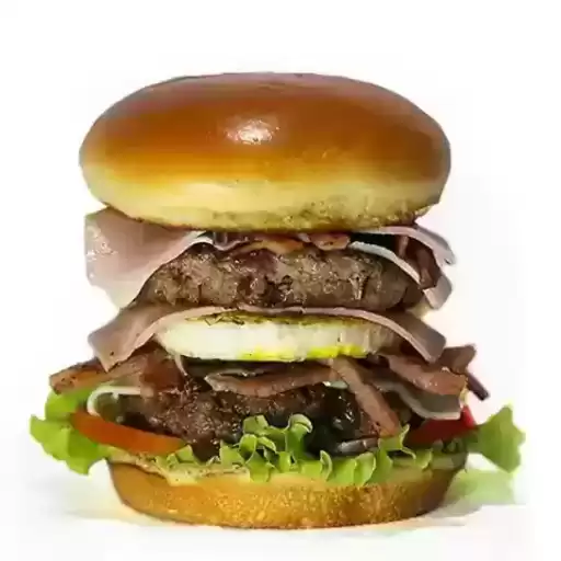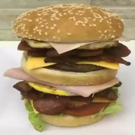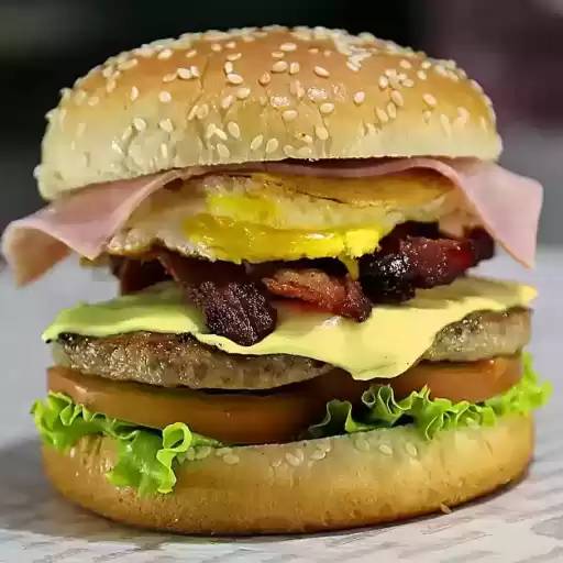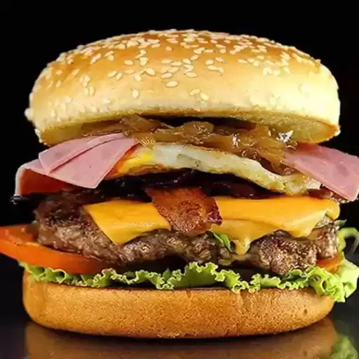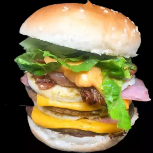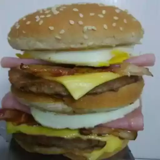 Saboreie esse hamburguer com 2 pães, 2 carnes bovinas 140g, ovo, queijo, presunto, cheddar, bacon crocante, calabresa, ... Ver completo